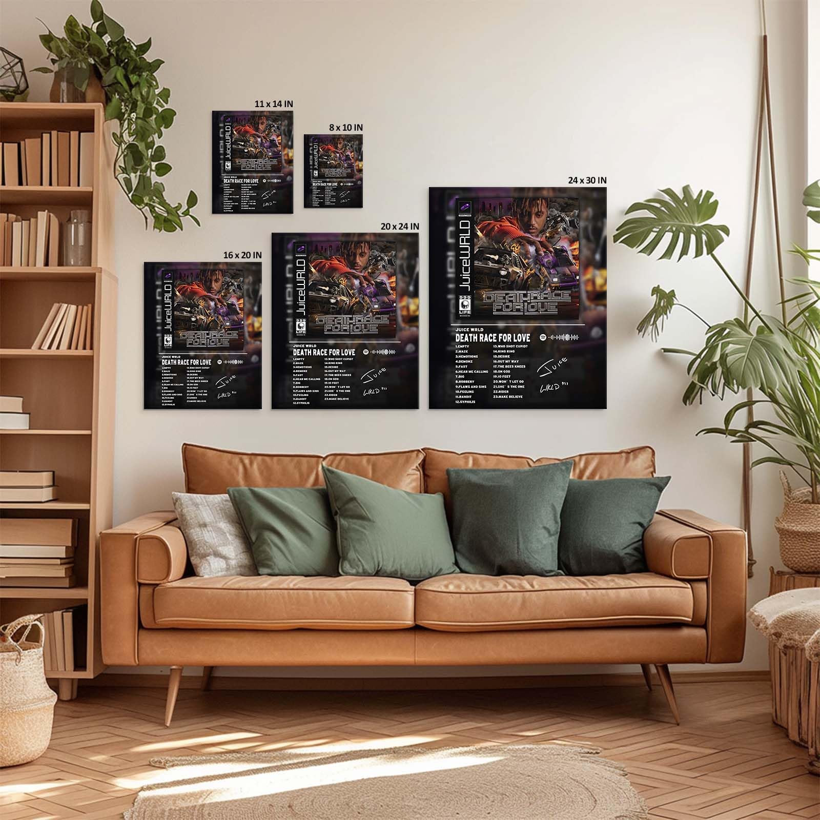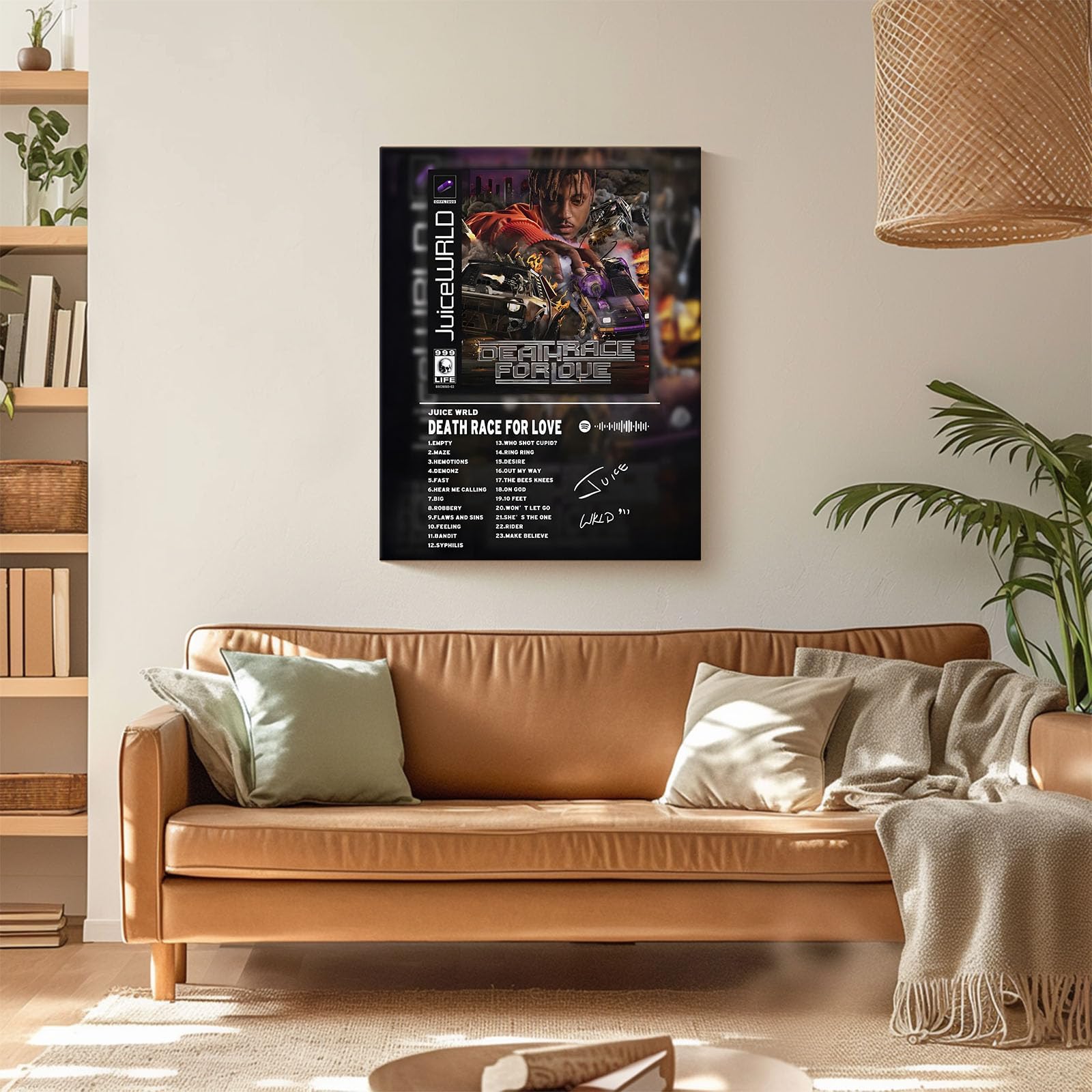 - RACING INTO YOUR WALLS DECOR – Bring the adrenaline of Juice WRLD’s "Death Race for Love" into your home with this intense and action-packed canvas print. Perfect for music studios, living rooms, or creative spaces, this striking artwork channels the raw emotion and excitement of his iconic album, adding a unique edge to any setting.