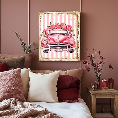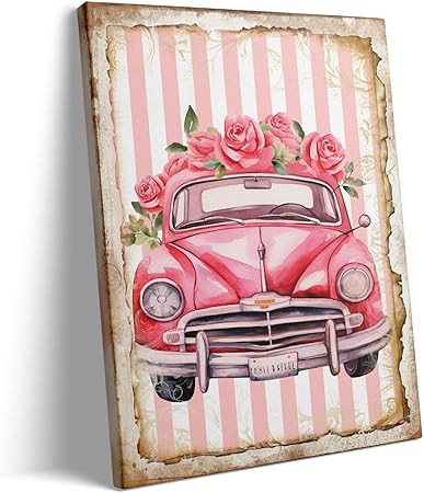 - Romantic Vintage Design – This canvas wall art features a charming vintage pink car adorned with lush roses, set against a soft striped background, adding elegance and love to your home decor.