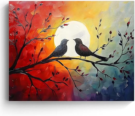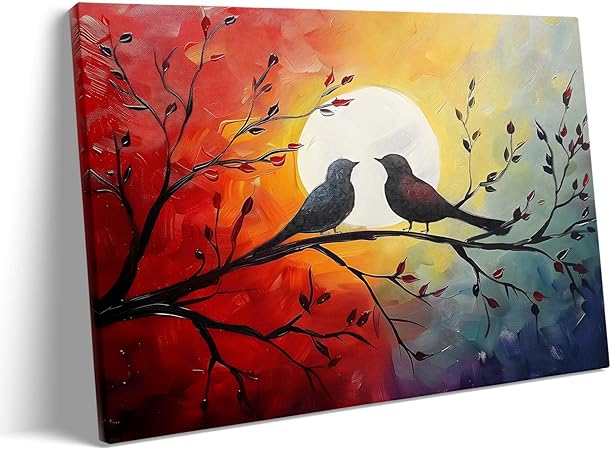 - Romantic Couple's Design: Features two birds perched on a branch against a vivid sunset, symbolizing love and togetherness, perfect for Valentine's Day decor.